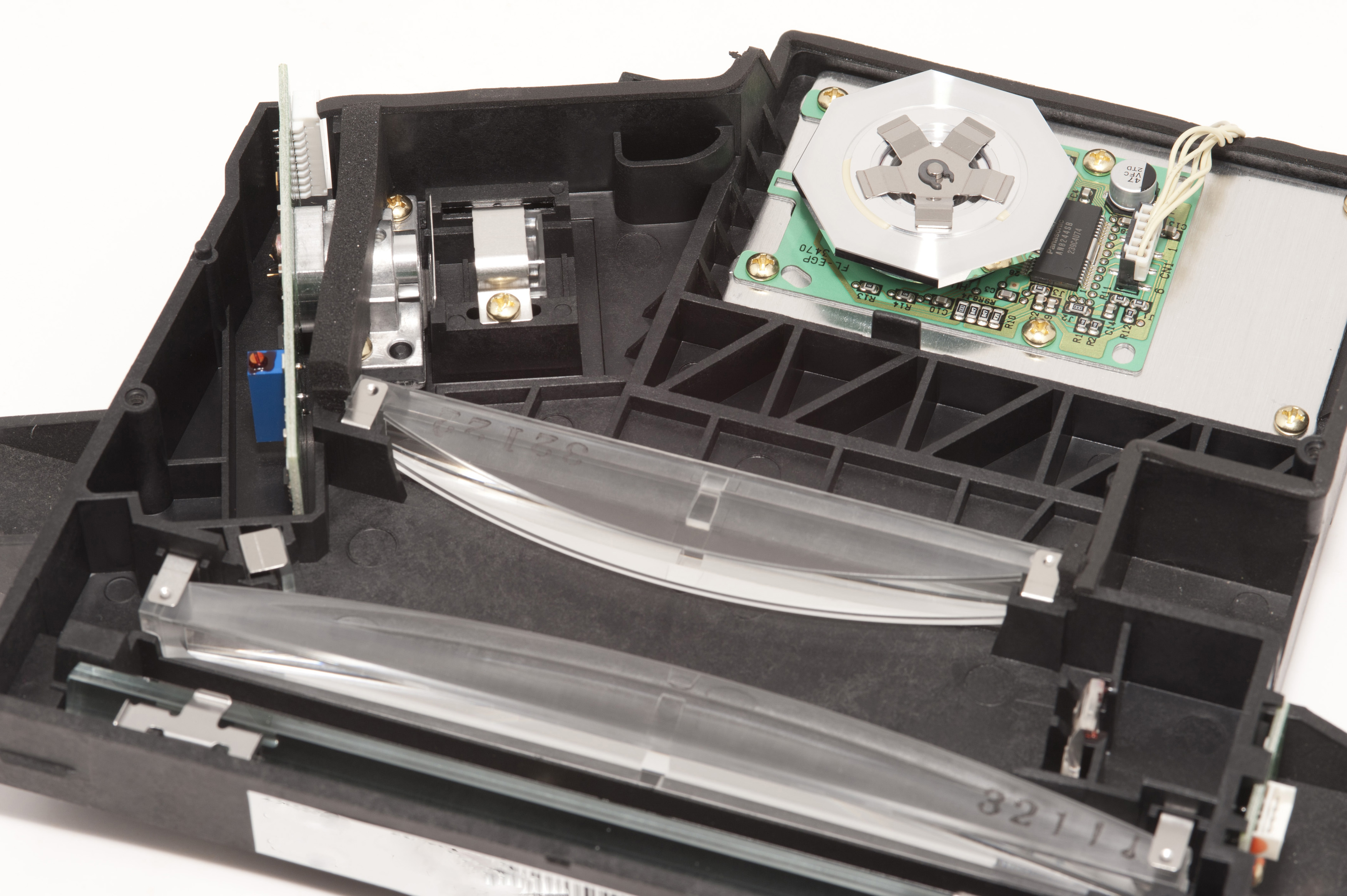 interor of a laser printer; the laser at the upper lens if focuesd trhough a mirror and them reflected from a spinning octagonal mirro upper centre; it is then reflected through a wide lens at the bottom of the picture onto a static charged drum