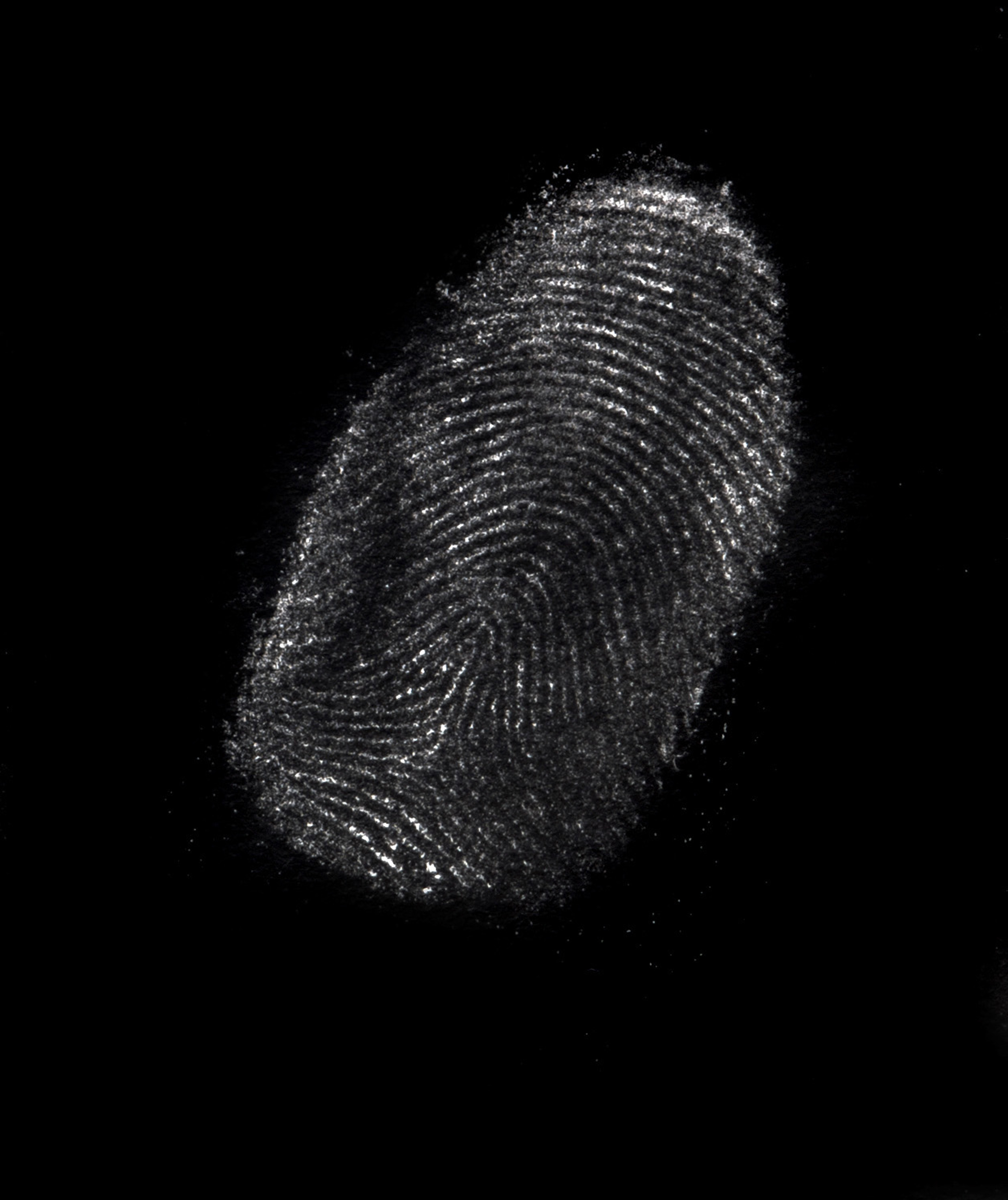 Clear finger print on a black background with ridge and whorl detail used in identification of a person for security or in solving a crime