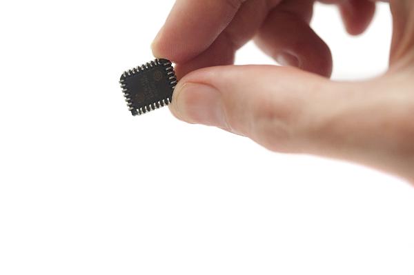 Hand Holding Microchip with fingertips up close. this chip was used to stop computer code known as firmware