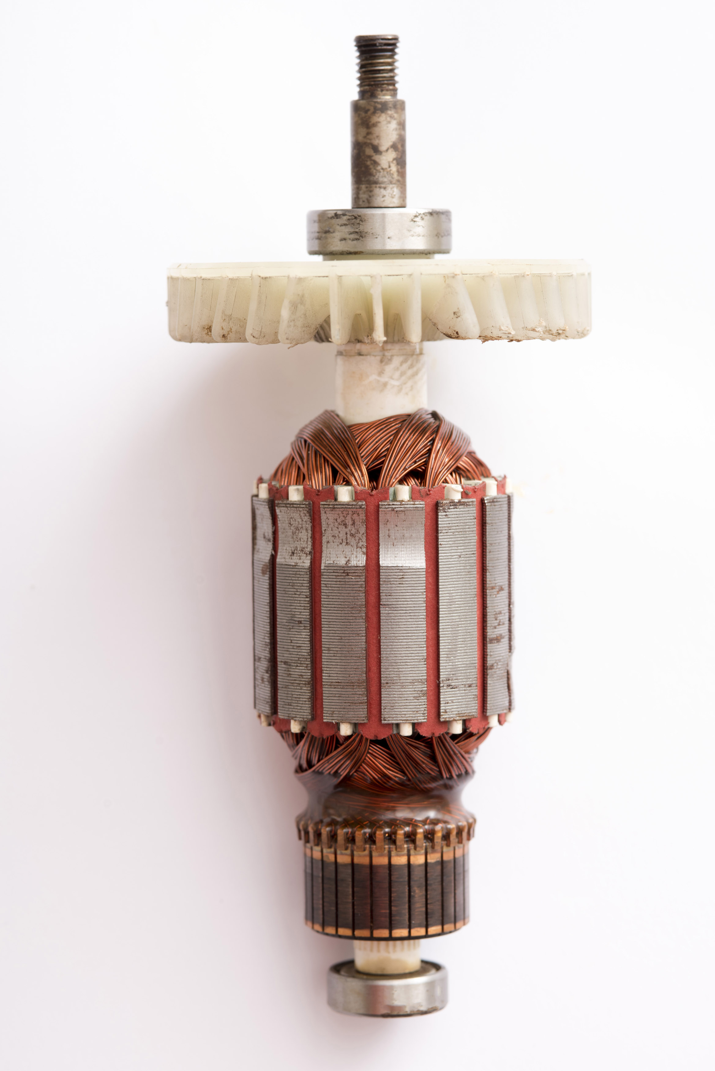 Close up overhead side view of a motor rotor and fan isolated on white with copy space