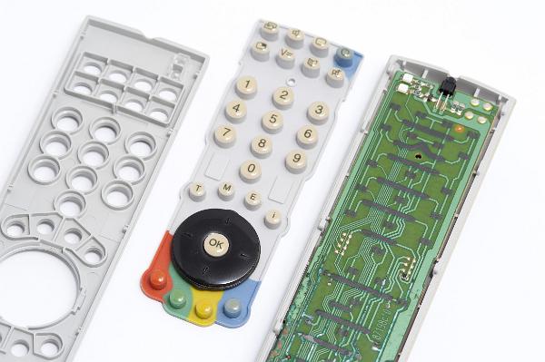 Disassembled remote control lying in three parts showing the case, buttons or keypad and the electronic circuitry. The buttons are formed of flexible rubber and a conductive carbon pad which connects to pads on the circuitboard when the button is pressed