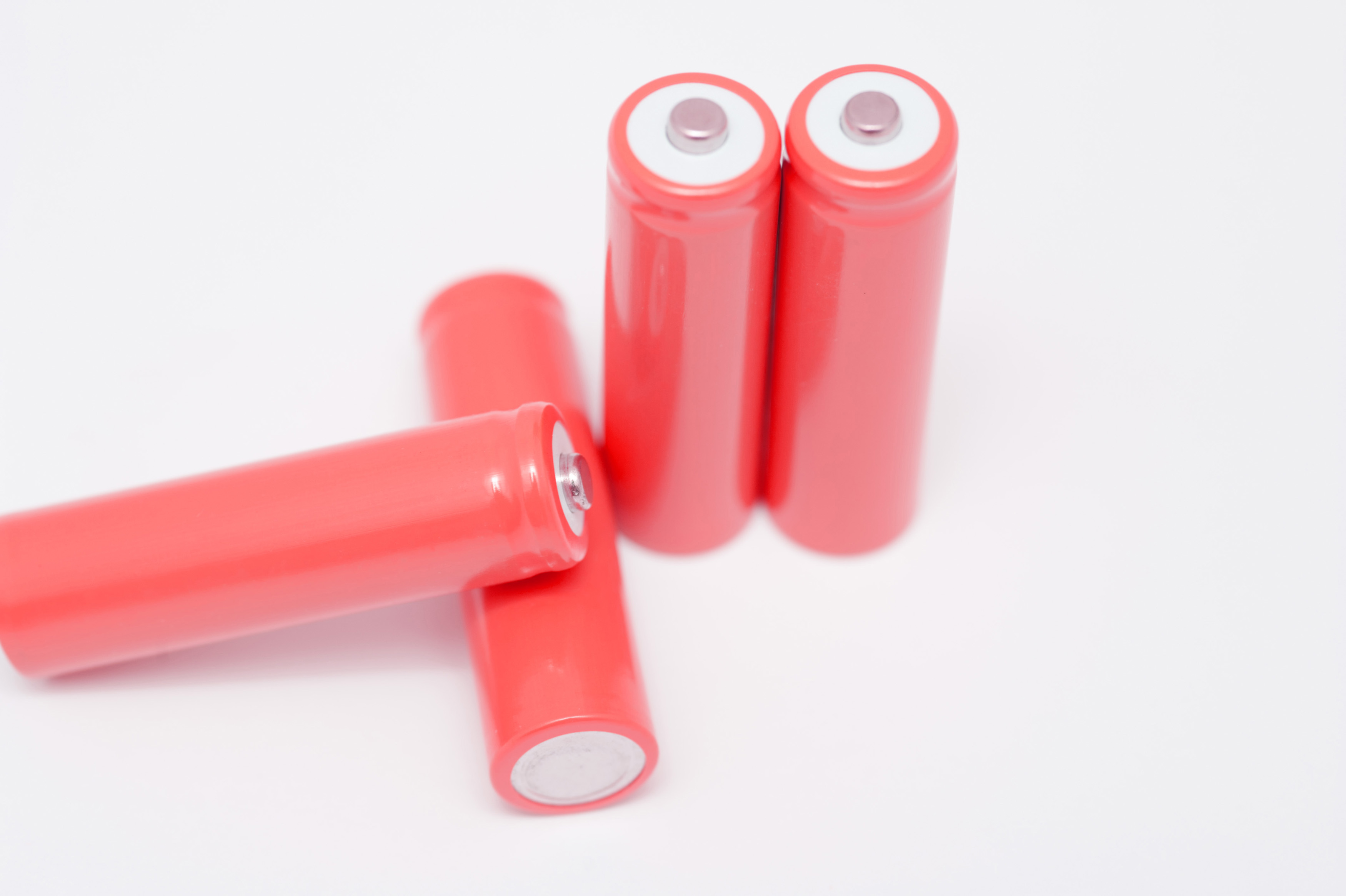 Set of four unbranded pink batteries with two upright and two displayed to show the positive and negative terminals on a white background