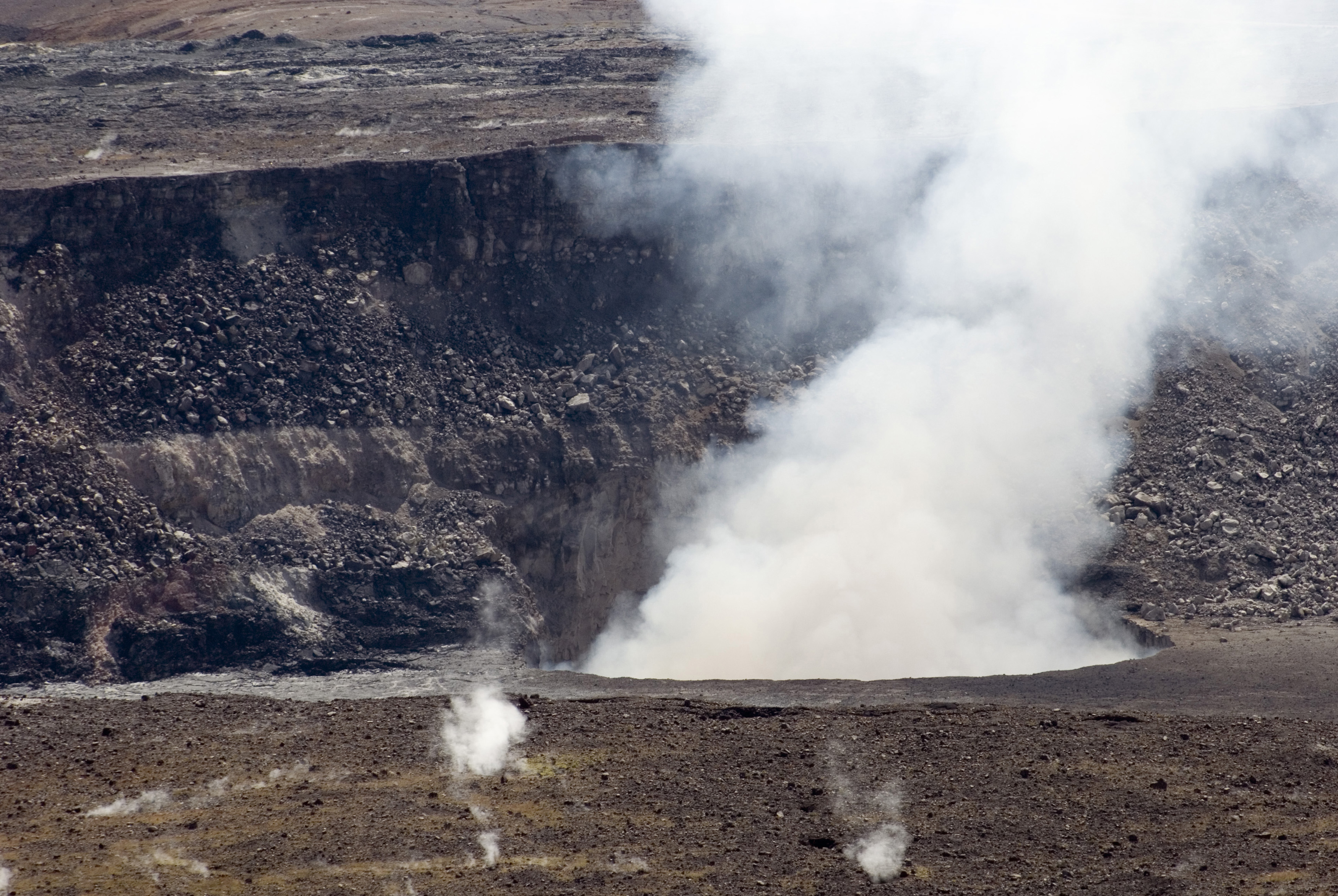 - caldera kilauea volcano smoke steam vent gas halemaumau crater black volcanic rock rocks