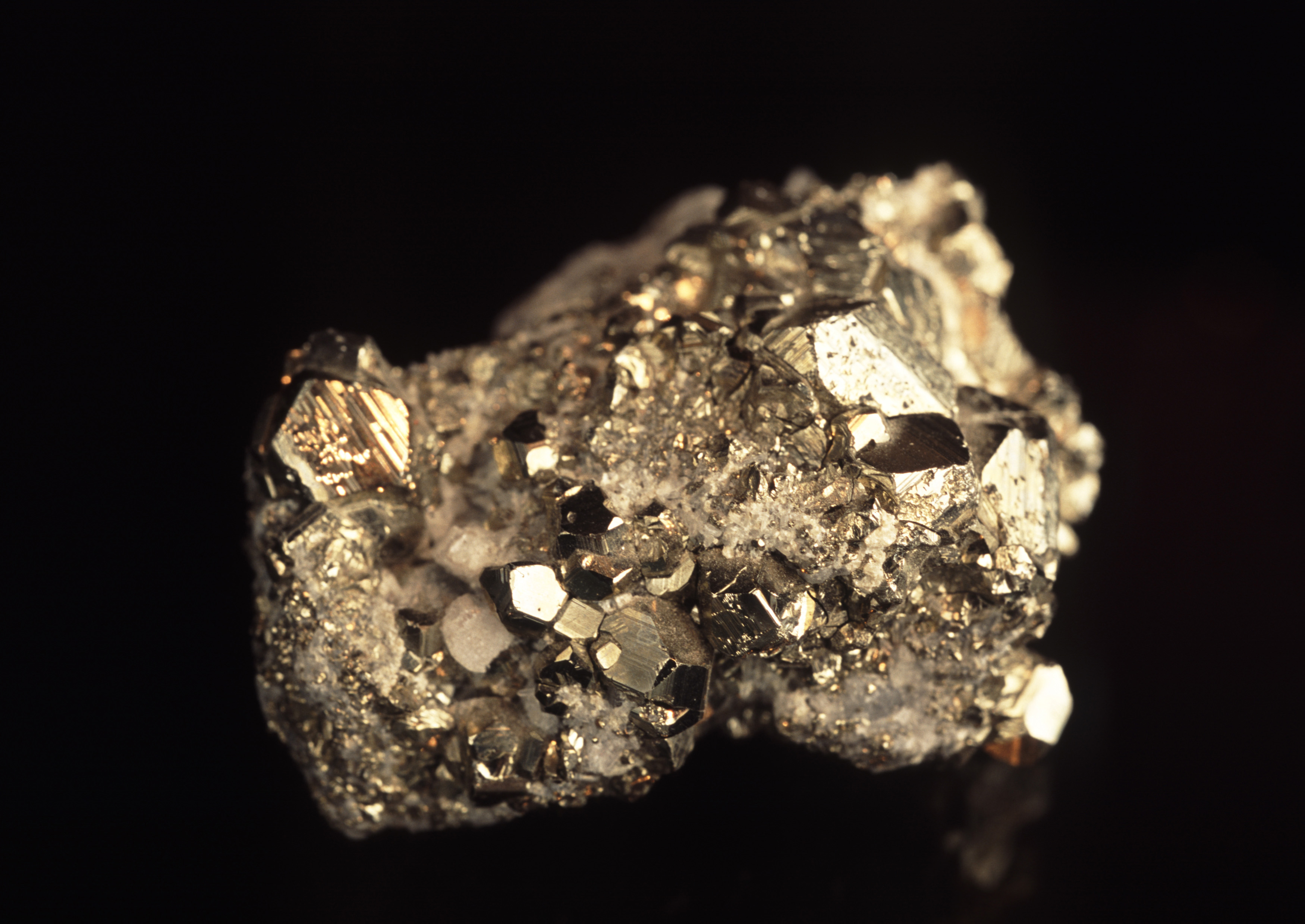 Specimen of golden metalllic iron pyrites or Fools Gold, composed of iron sulfide used as iron ore and in the production of sulphuric acid and sulphur dioxide
